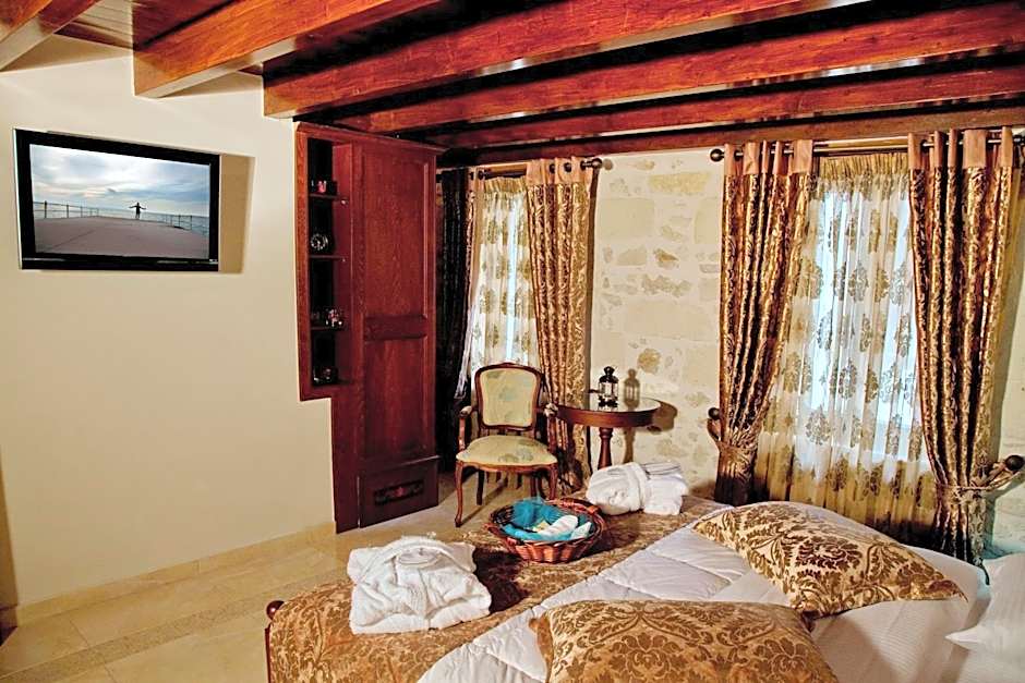 The suite features stone walls and dark wood furnishings. There is a marble bathroom with a spa bath, as well as air conditioning and satellite TV. Bathrobes and slippers are provided, as well as natural toiletries made with olive oil. Mineral water and tea and coffee making facilities are available and there is a safe that can store a 15" laptop.